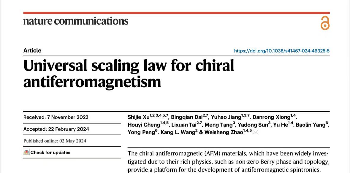 Xu S, Dai B, Jiang Y, Xiong D, Cheng H, Tai L, Tang M, Sun Y, He Y, Yang B, Peng Y. Universal scaling law for chiral antiferromagnetism. Nature communications. 2024 May 2;15(1):3717.
