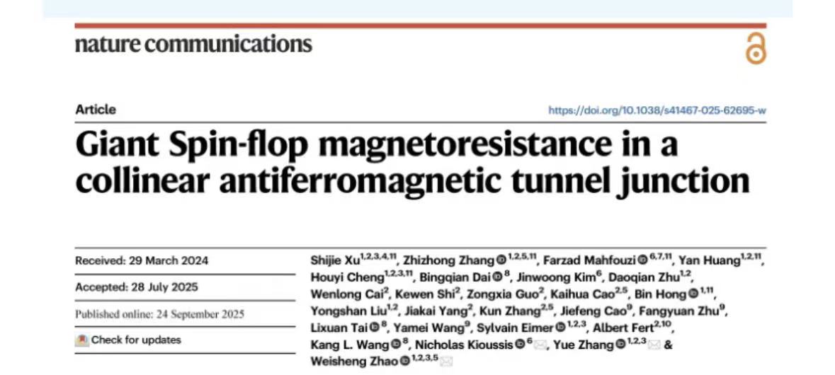 Xu S, Zhang Z, Mahfouzi F, Huang Y, Cheng H, Dai B, Kim J, Zhu D, Cai W, Shi K, Guo Z. Giant Spin-flop magnetoresistance in a collinear antiferromagnetic tunnel junction. Nature Communications. 2025 Sep 24;16(1):8370.