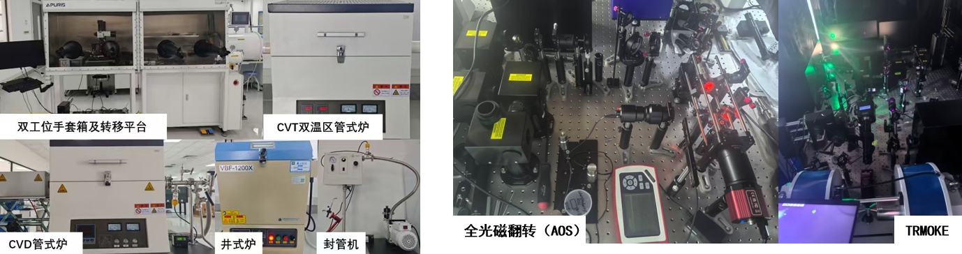 在材料制备方面:本课题组拥有磁控溅射、化学气相输运(CVT)、化学气相沉积(CVD)、手套箱(含二维材料转移平台)等材料制备和转移设备,可以实现磁性多层膜异质结构、高质量单晶块材、二维磁性材料的可控制备;在超快自旋动力学分析方面:本课题组拥有以飞秒脉冲激光器为基础的、自主搭建的时间分辨全光Pump-Probe测量设备;本课题组还拥有其他基本磁性表征及测试公共设备。