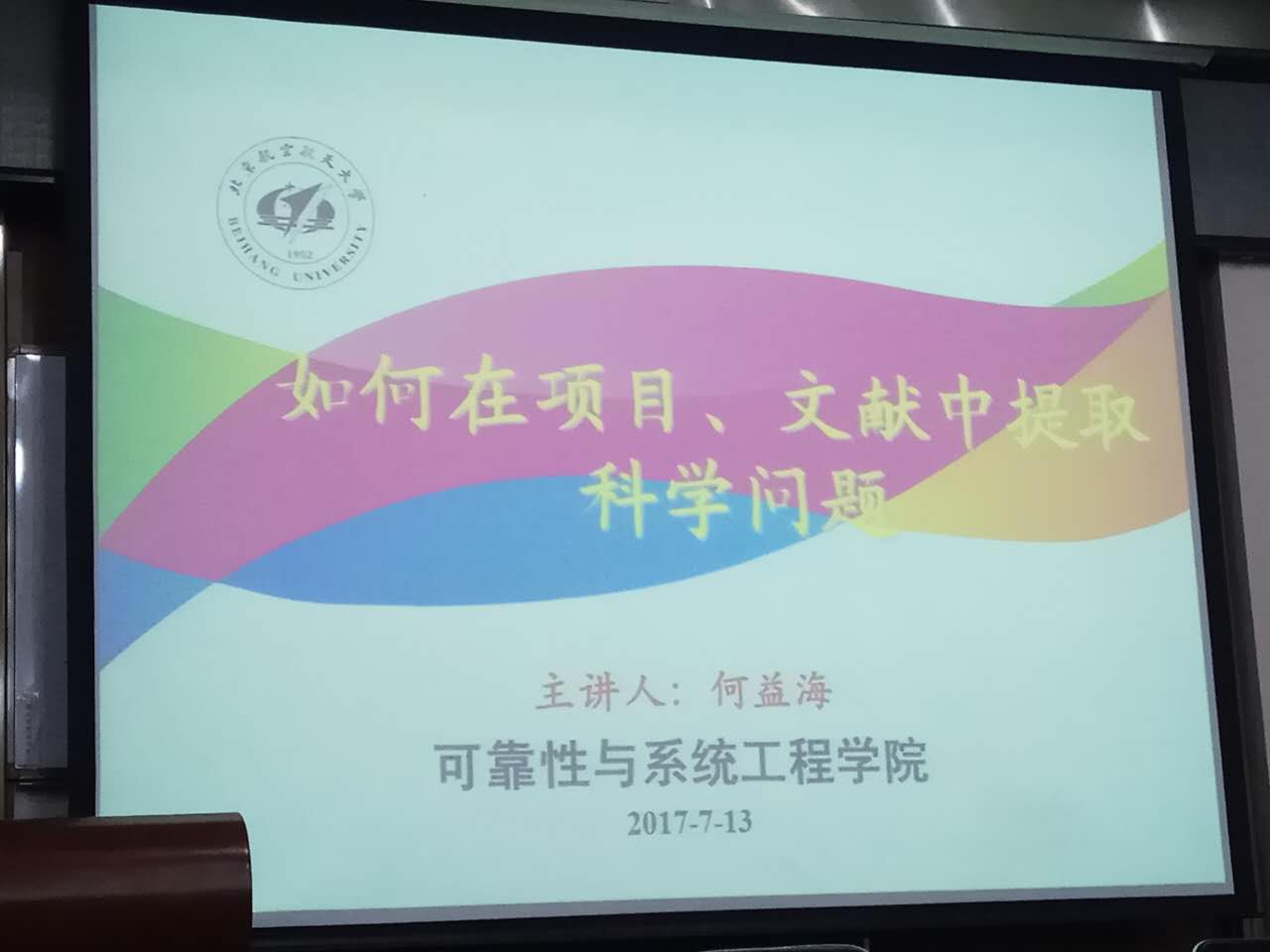 2017年7月13日下午19时00分,受可靠性与系统工程学院研究生协会学术部的邀请,实验室何益海老师面向全院研究生做了一场主题为“如何在项目或文献中提取科学问题”的学术讲座。该报告目的主要是为了能充分调动我院学生对学术科研的积极性,鼓励更多的学生参与到学术科研之中,提升我院学生在学术科研时讲究方式方法的意识和能力,提升学生的创新意识和培养学生以学为乐、学以致用的能力。